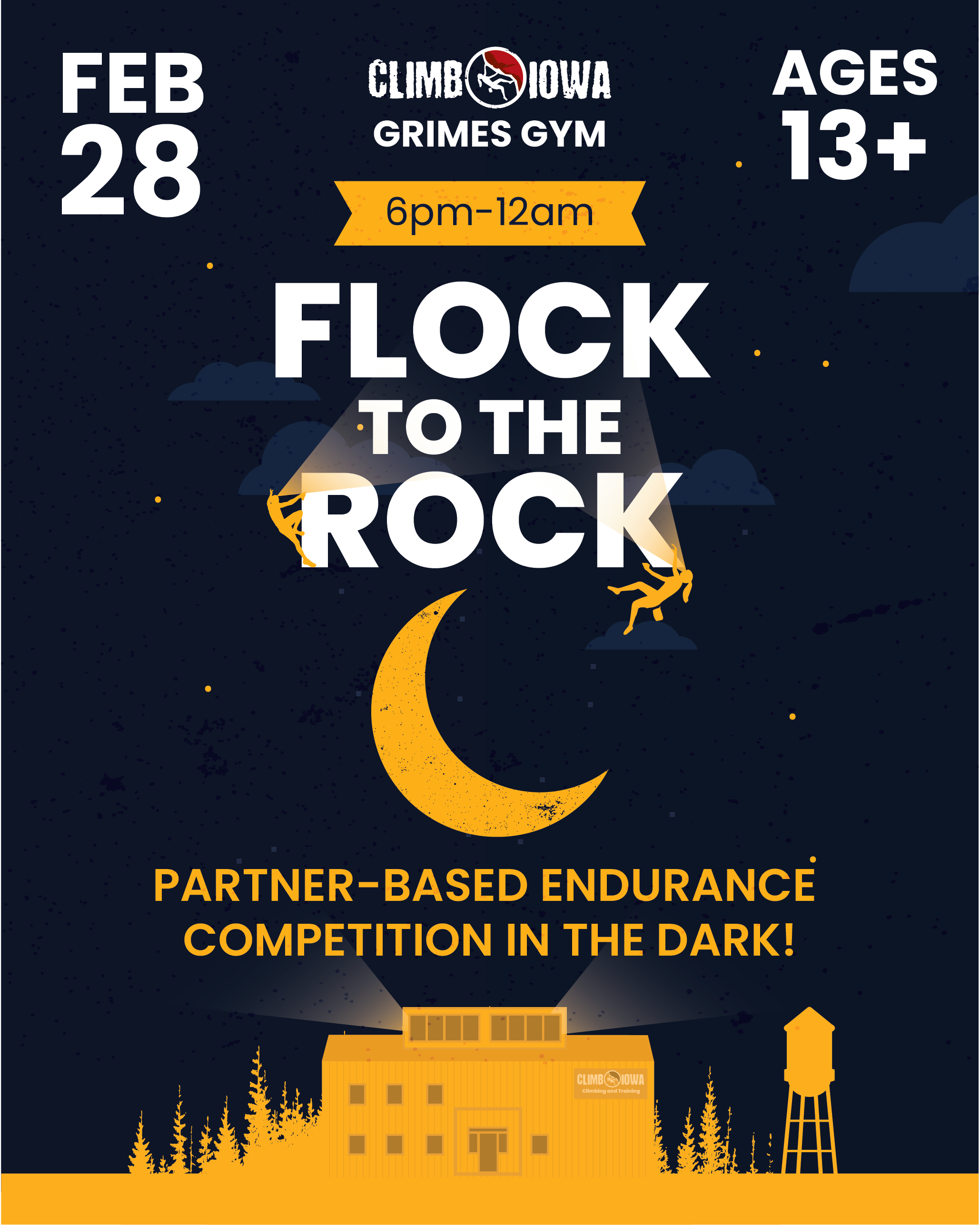 Build a team of two & join us for a partner-based climbing competition in the dark. Running for 6 hours, Flock to the Rock is the ultimate test of teamwork, as you and your partner compete for the most routes or points in this endurance competition lit by headlamp!